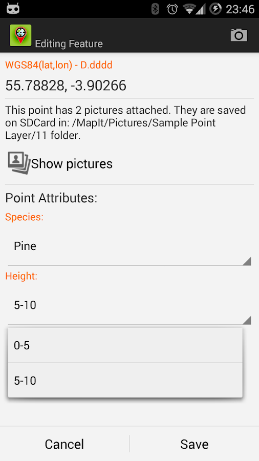 Al registar la localización, simplemente introduzca los atributos necesarios de la lista desplegable definida previamnete, no hay necesidad de escribir la misma información una y otra vez. Importe larga lista de atributos de archivos de texto y vuelva a utilizarlas en varios proyectos. Si es necesario, también puede añadir una o varias imágenes para cada ubicación.