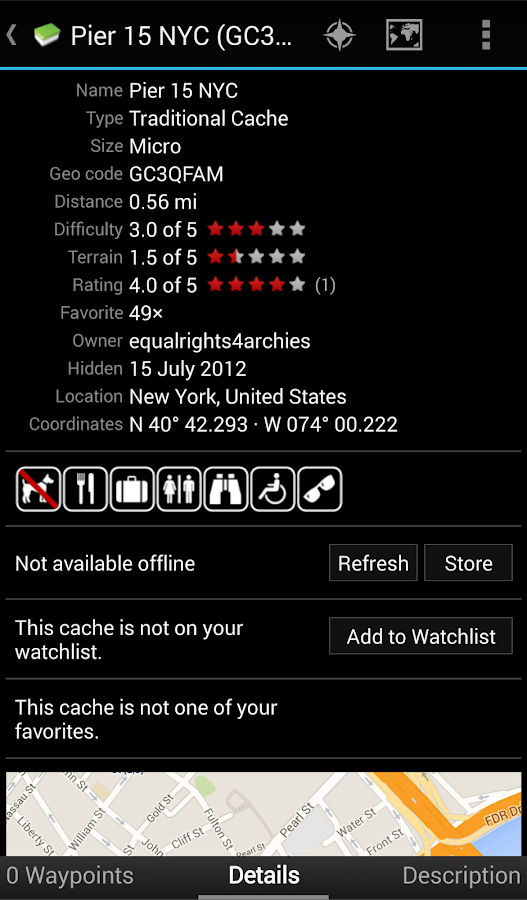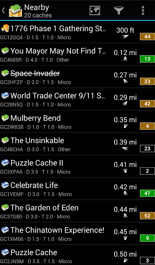 Puedes usar los cachés guardados junto con los mapas sin conexión o mapas estáticos para buscar cachés sin estar conectado a internet (p.ej. en el extranjero).