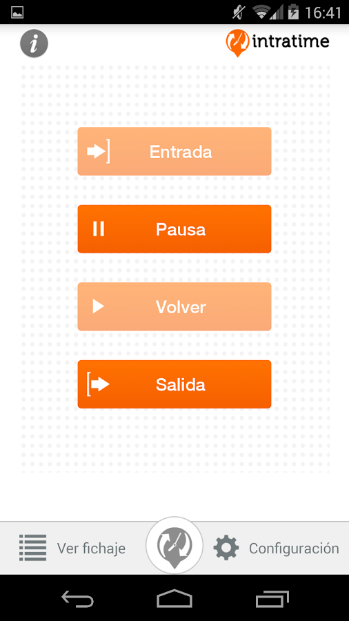 Intratime tiene un funcionamiento muy sencillo y práctico. En la pantalla principal tenemos las opciones de Entrada, Pausa, regreso y Salida, con las que vamos a poder gestionar el momento en el que comenzamos o terminamos de trabajar, o los diferentes descansos que pudiéramos realizar durante cada jornada laboral.